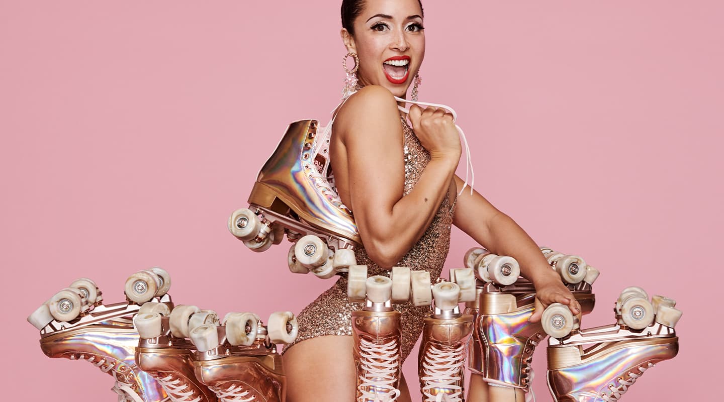 We have teamed up with legendary roller skater, hula hooper, designer (and more!), Marawa the Amazing – to create her dream Marawa Rose Gold Quad Skates. A fun and custom-designed update to our signature quad skates, these exclusive skates feature rose gold hardware, custom lining, marbled wheels and stoppers, and a rose gold holographic finish. We’ve even worked with Marawa to create the perfect protective set to match!